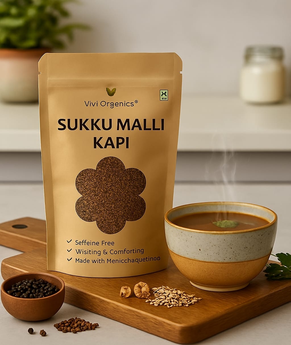 - Mix 2–3 teaspoons of Sukku Malli Kapi powder in a cup of hot water or milk.